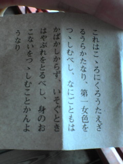 0509 広島 おみくじ 2005年9月10日 土曜日 nao-cha コメントする 「平」ってことは吉?? 「第一女色をつつしむべし」って書いてあるけど、ワタシ女なんですが(笑) 旅立は「よし、ゆくさきによろこびごどあり」ですってo(^-^)o