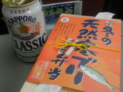 0812 北海道 スーパー北斗 2008年12月20日 土曜日 nao-cha コメントする オハヨウゴザイマス。 今日の北海道も雨。 暖かいです。 まもなく発車の列車で函館に移動します。 本日の朝食は、冬の天然寒ブリ弁当。 冬の駅弁は必ずコレだなあ。 缶が朝からあるのは仕様です。