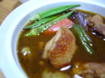 ![]() 「本日のスープカレーのスープ」。これはスープのみの販売なので、具は自分で用意せねばなりません。オーソドックスにチキンカレーにしてみましたよ。オクラ好きなのでオクラトッピングで。トッピングは100円増しになります。うそです。