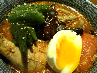 しかし携帯の写真はキレイになったものだ。 「チキンと野菜のスープカリー」。スープカレー界では定番メニューでございます。迷った時はこれを食えと祖父も申しておりました。 うそです。 辛さのランクは10番(単位忘れた)。あっさり目のスープにいりごまが効いて、肉はホロホロ、野菜はシャッキリで美味しかったです。もちろんワタシはオクラをトッピングしましたよ。やっぱりスープカレーにはオクラがマストだと思います。 この席で友人2人と、1月31日までに5キロ痩せる対決をはじめました。あ、うち1人は禁煙。 今のところの罰ゲームは、 札幌にスープカレーを食べに行く旅費を3人分出す。でも、負けた人はスープカレーは食べられない というものです。なんて過酷! そんな金はびた一文も出せないので、頑張って痩せます。痩せてみようじゃないの。見てろ〜! |
