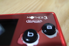world」裏には「MOTHER3」の文字が。かすれてるのがちょっとイイ感じ。 これが限定ミクロです。この模様を「ほぼ日」特設サイトで見た時に大興奮しまして会社で「買う買う!」なんてわめいてたんですねぇ。でもしばらく「ミクロ2つもあってどうする」と思い直しましてソフトだけ購入しようかと思ったんですよ。でも発売日ギリギリになって急に「やっぱり限定が好きなんだーーー!!」という魂の叫びによりamazonのボタンをポチッと押してしまいました。えぇ、まんまとはめられた訳です。 任天堂のロゴもかすれててメッチャカッコイイです正直「MOTHER」「MOTHER2」はやったことないんですわ。だから皆さんみたいに待ちに待ったという感じではないです。デラックスボックス特典の「フランクリンバッヂ」だって意味わかってないもん(笑) はてさて、RPG嫌いのワタシでも食いつけるか!? ちょろっと「MOTHER」のアドバンス版をやってみたけど、よくわからんかったぞ!!(笑)