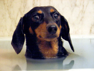 多分、今世界で一番お風呂が好きな犬だと思われ。 とにかく入るのが好きらしく、人間が先に入ってると「早く入れろ〜!」とドアをシャイニングのごとく叩きます。これが結構怖い。 で、入れてあげると、まずは湯船チェック。湯船にお湯が入ってるか確認する訳ですな。その後シャワーで身体を流すんですが、ちゃんと自分でシャワーの下にスタンバります。シャワー浴びないと湯船に入れてもらわない事を、すぐに覚えちゃいました。 その後だっこして湯船に浸かると、大きなため息をついてマッタリします。 昨日はついに、臭いおならまでしやがりました(泣) ま、これで長いこと苦労してた皮膚病がすっかり治ってしまってるのでいいんだけどさ。 |